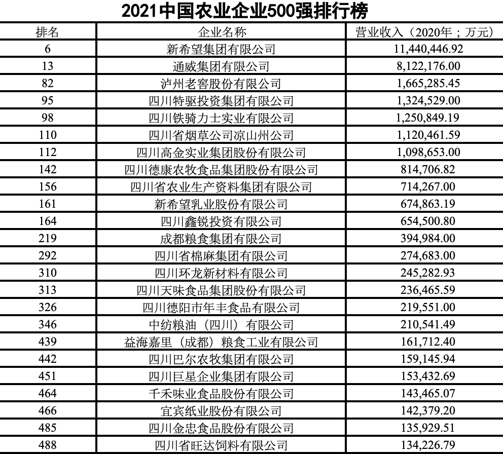 日前,农民日报社发起了第五届中国农业企业500强评价活动,四川省共24家企业入围2021中国农业企业500强。四川省新希望集团有限公司以营业收入1144.04亿元入选,排行第六、通威集团有限公司以营业收入812.22亿元入选,排行第十三。