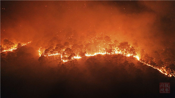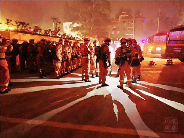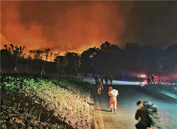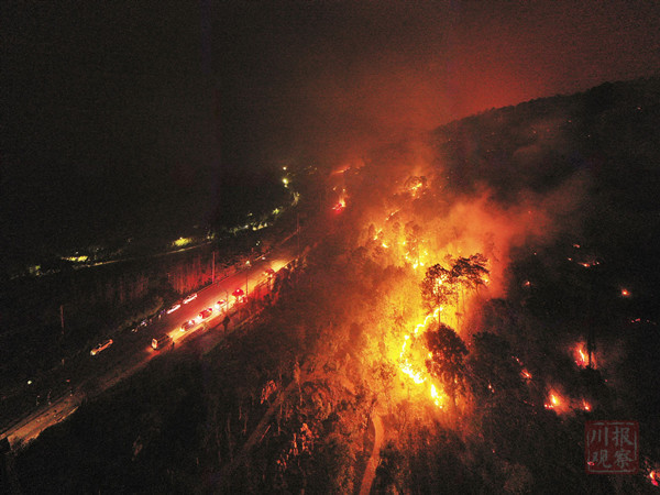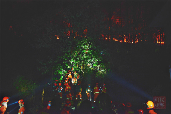 4月1日晚23时,西昌泸山上的火线把天空映照得通红,呼啸着向山脚压来。泸山脚下人头攒动,各方救援力量紧急集结,迅速投入战斗。
