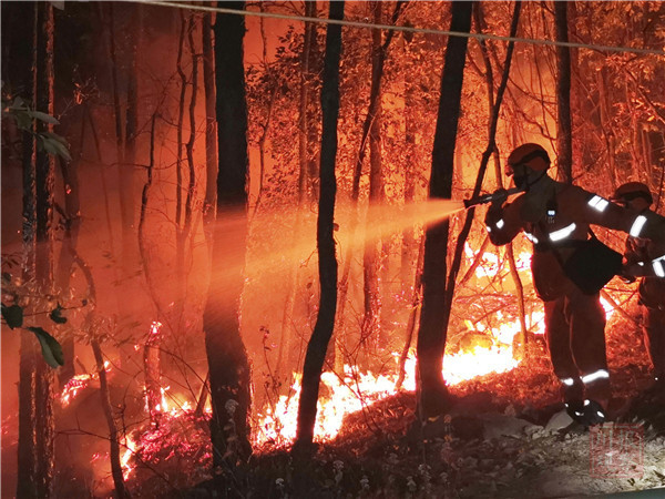 沿山坡向上,消防队很快便抵达火场。“1、2、3、4……”打开头盔上的强光电筒,苟强再一次现场清点队员人数,而后各班组随即投入一线战斗。