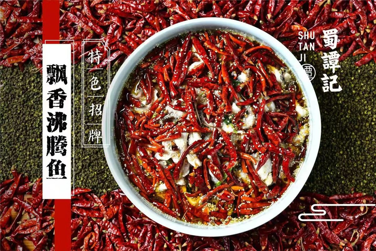 “飘香沸腾鱼”称得上蜀谭记家的当家花旦。对这道特色名菜,蜀谭记采用新派水煮鱼做法,一次性用油健康又美味,广东空运黑鱼,鲜活宰杀,搭配魔鬼辣、印度椒等食材精烹而成,油而不腻、麻而不苦,将鱼肉的肉嫩味美烘托到极佳!最后的淋油环节,堪称经典。将辣椒、花椒的麻辣鲜香味一触即发、全线唤醒,上桌还在隐隐跳跃的热油,飘香四溢、引人垂涎。鱼肉片片厚实细嫩、绵密爽滑,辣而不燥,伴着脆爽的豆芽和芹菜,非常爽口!