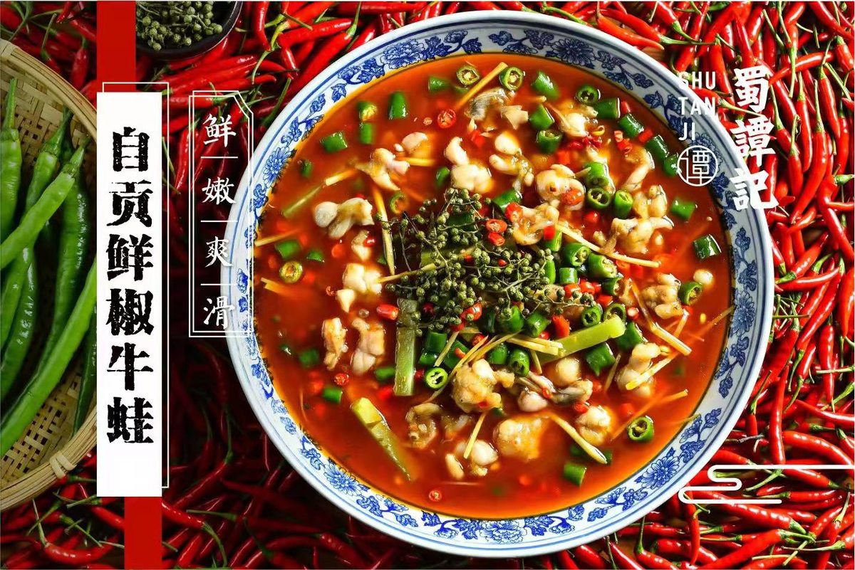 错过这道“自贡鲜椒牛蛙”你可就白来了!蜀谭记家采用半汤的做法,更加健康入味。明眼看得到的大块儿牛蛙,伴着野生泡椒、尖椒、小米辣、仔姜等食材,香辣味不停地窜鼻,勾得人食欲难耐!活蛙现点现杀才能保证肉质的紧实弹性,牛蛙块块儿健硕肉厚,细腻软嫩、红油爽舌的牛蛙肉,充分吸收了汤底的鲜辣麻香,一抿脱骨,二抿肉烂,三抿油香,口口回味无穷。