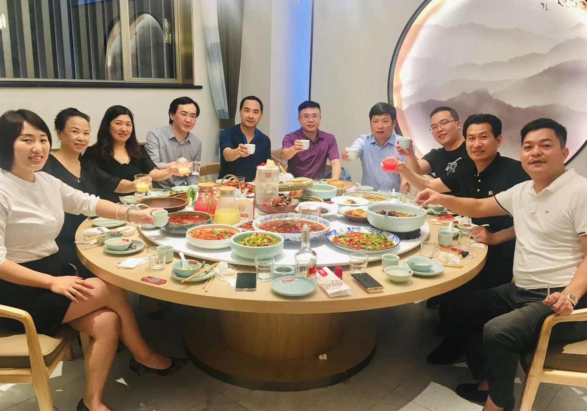 我们一边频频举杯喝酒,一边大声武气嘻哈打笑地摆龙门阵,鸭脑壳啃得正带劲时,见几个人大大咧咧推门进入敬酒来了,原来是隔壁“沿滩”厅的张总李总王总几个哥们,大家碰杯互祝身体健康生意兴隆,当然个别人还要勾肩搭背耳语几句或者接着酒兴开下玩笑才作罢。“沿滩”的刚走,“贡井”的又来了。大家礼尚往来,我们也没少去互动,乡音乡菜乡情,盐都人欢聚蜀谭记不亦乐乎。