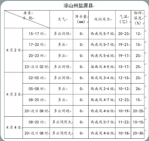 根据最新气象资料分析,四川省气象台预计:2020年4月3~4月5日,甘孜州西南部和攀西地区大部以多云间晴的天气为主,湿度小空气干燥、风力大,森林火险气象等级可达4~5级。