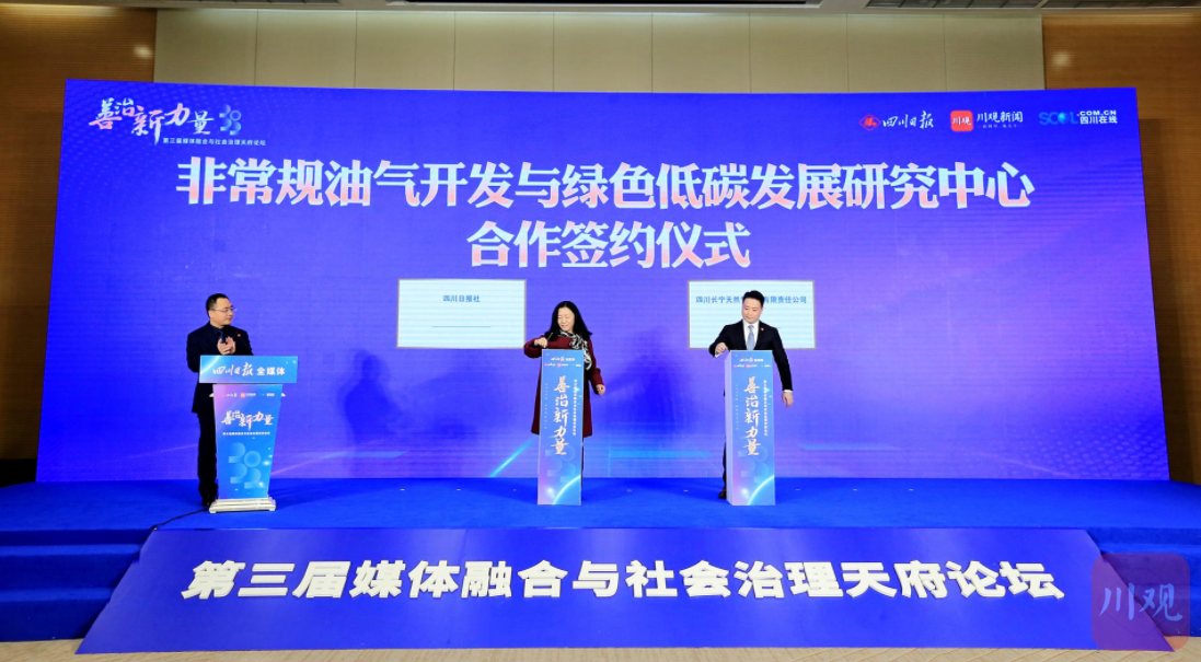 论坛现场,四川日报社与四川长宁天然气开发有限责任公司签署合作备忘录,“非常规油气开发与绿色低碳发展研究中心”正式成立。此外,川观新闻与百度百家号签署合作协议,四川云、腾讯云共建内容数字资产技术应用实验室正式揭牌。