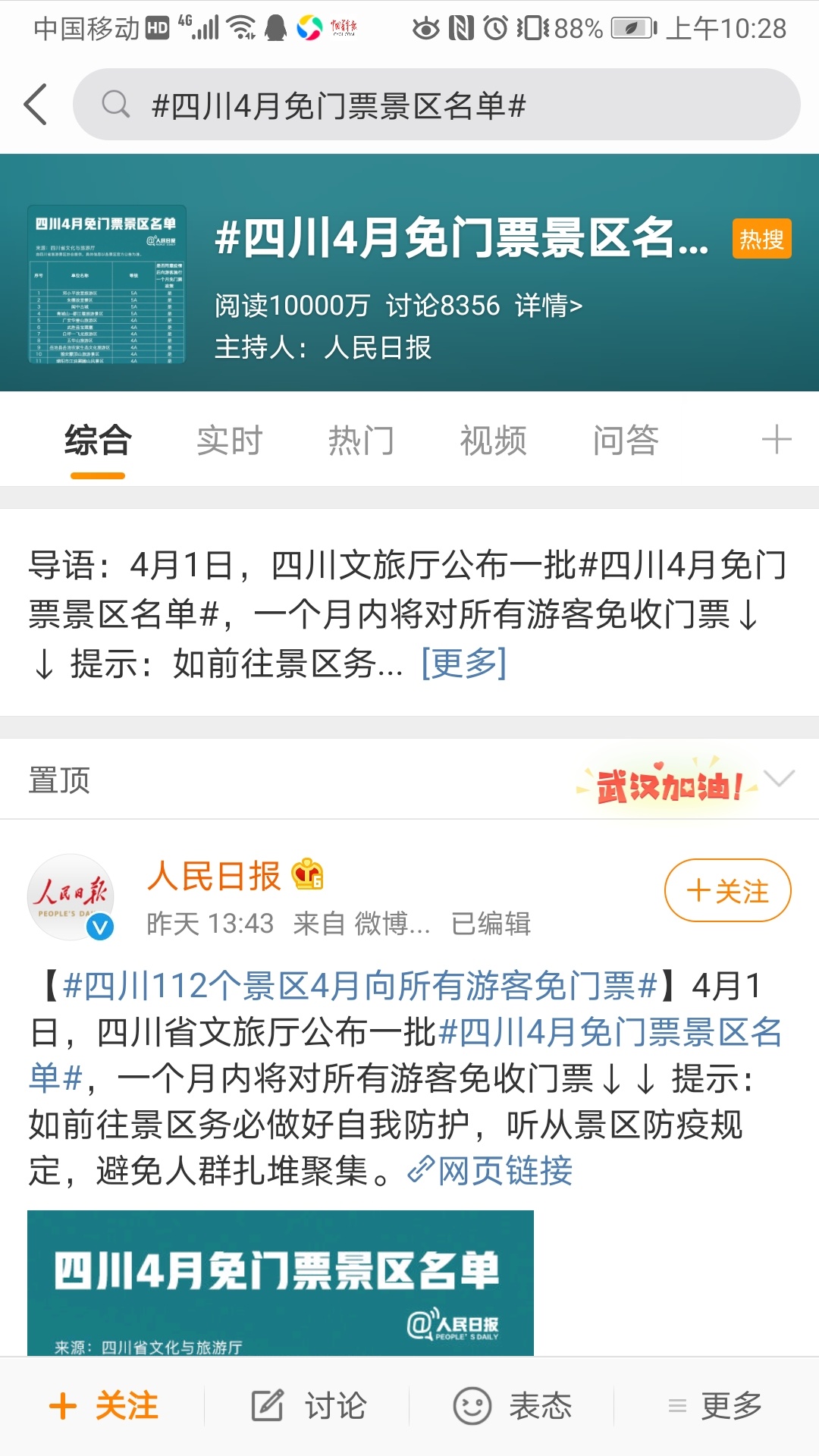 截至4月3日上午10点半,经“人民日报”官方微博发起的“四川4月免门票景区名单”单个话题在微博上的阅读量已超过了1亿,登上热搜。