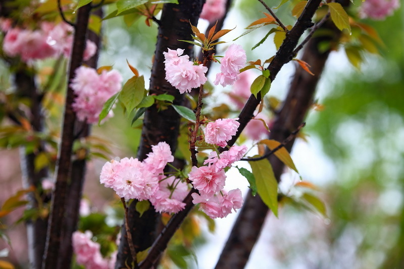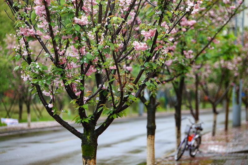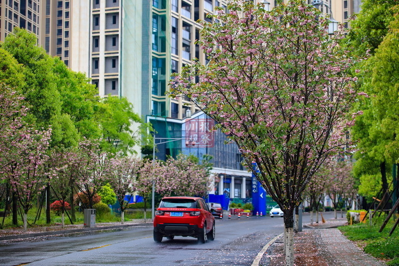 视频和图片为4月3日,在城区雅雨路沿线,春雨滋润下的妍丽樱花。