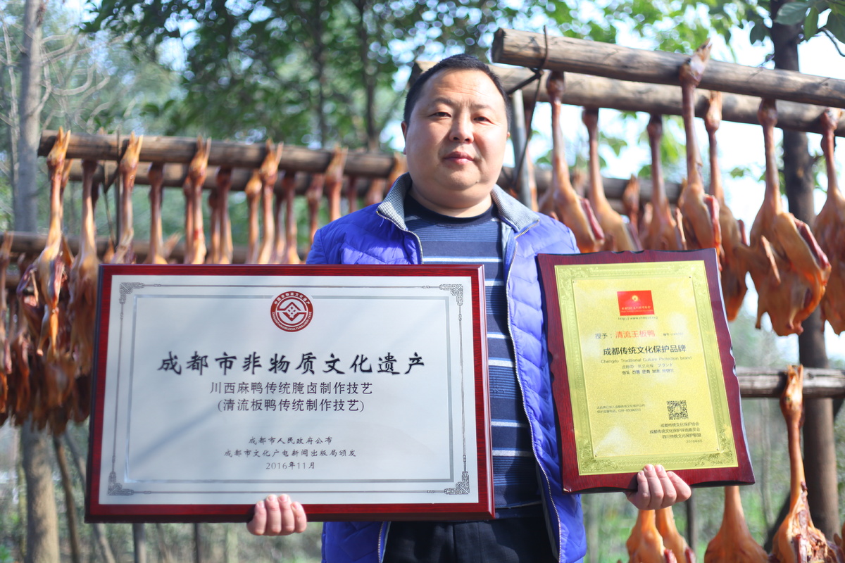 清流板鸭有历史记载始于1916年。新繁人黄策开始做板鸭起家,用清流泉水稻田散养的麻鸭品质好,1941年起,其弟黄德勋开始将其做成板鸭,人称为“黄板鸭”。当前的第四代传人王忠述是清流镇人,19岁拜师学徒,得师傅真传后,在本镇场上开业,号称“王板鸭”,传统板鸭制作技术由王忠述发扬光大。