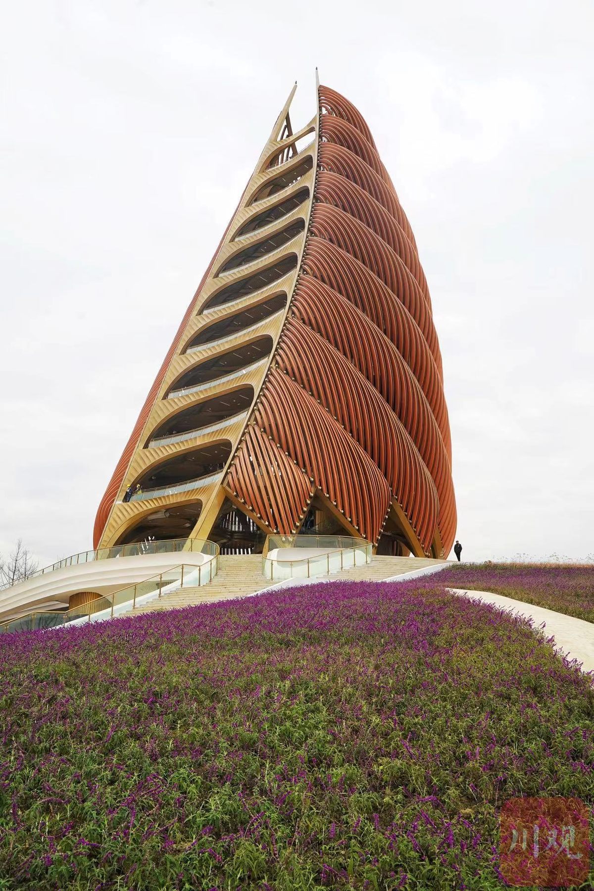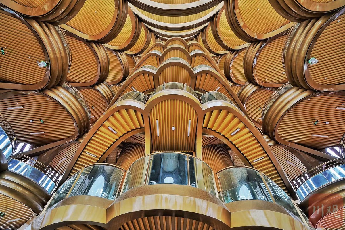 熊猫塔内部泛着金色光泽,层层堆叠的圆盘状金属结构颇具科幻感。瞭望塔内部,是团簇分布的81片金色“芙蓉花瓣”。这些“芙蓉花瓣”正是观光瞭望塔的载人平台。81个平台渐进式分布在瞭望塔内部,每一片平台都采用了成都市花芙蓉花瓣的造型,供游客观光休闲。