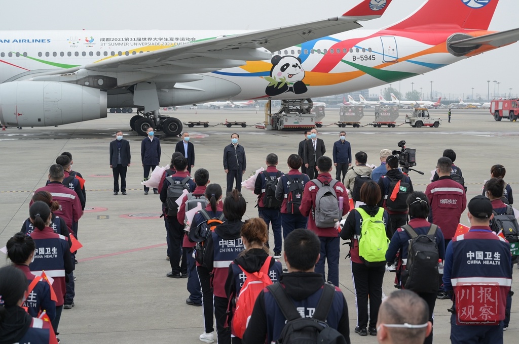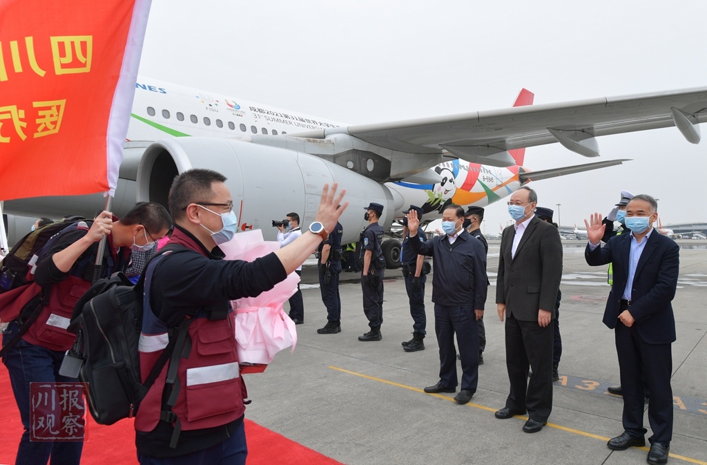 4月7日下午,我省援湖北医疗卫生队最后一批162名队员在圆满完成各项任务后,从武汉平安飞抵成都。省委书记彭清华,省委副书记、省长尹力前往机场迎接,欢迎他们回家,代表省委、省政府和9100多万父老乡亲,向所有援鄂英雄表示诚挚问候和崇高敬意。