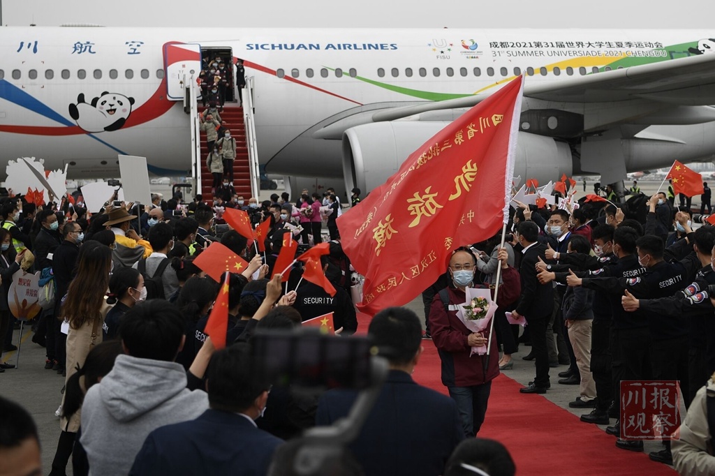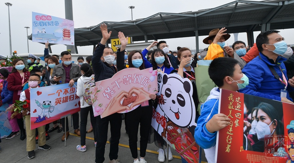 援鄂医疗卫生队归来牵动着全川人民的心。成都双流国际机场停机坪内,悬挂着“热烈欢迎四川援助湖北医疗卫生队凯旋”横幅,医疗卫生队员家属代表拿着孩子手绘图画和“终于等到你”“想见你、来接你”等标语牌在等候区翘首以待,满怀喜悦和激动之情。