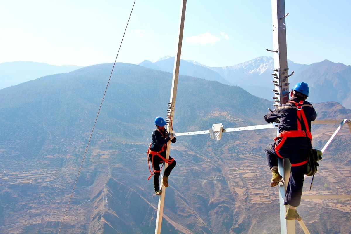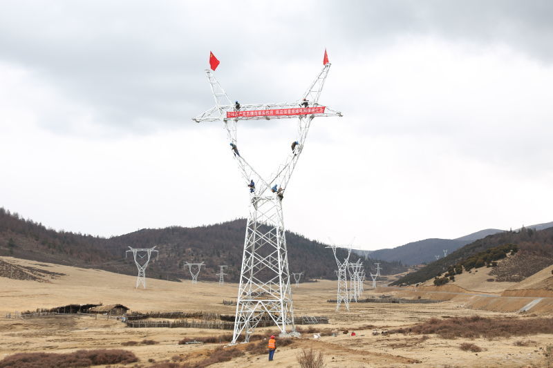 4月7日,海拔4100米的甘孜州巴塘县中咱镇110千伏输电线路的建设施工现场,机器轰鸣,一座近30米高的铁塔在山脊上巍然耸立。