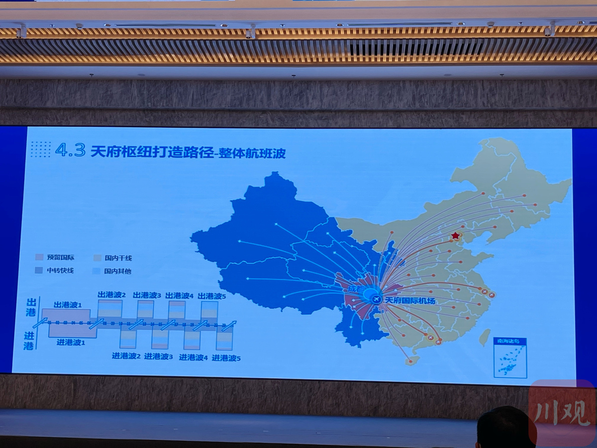 天府机场至上海、武汉的航班作为“五进五出”航班波中国内中转快线,在全天的波谷波峰均匀分布。天府快线的打造既满足点对点出行需求,又增加中转衔接机会。