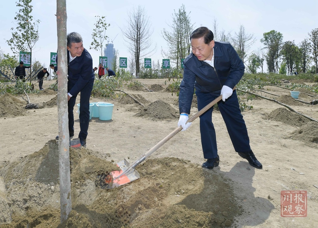 4月8日,省委书记彭清华到成都市调研公园城市建设推进情况。在天府中央公园,彭清华与天府新区干部群众一起植树造林,为公园城市建设再添一抹绿、贡献一份力。