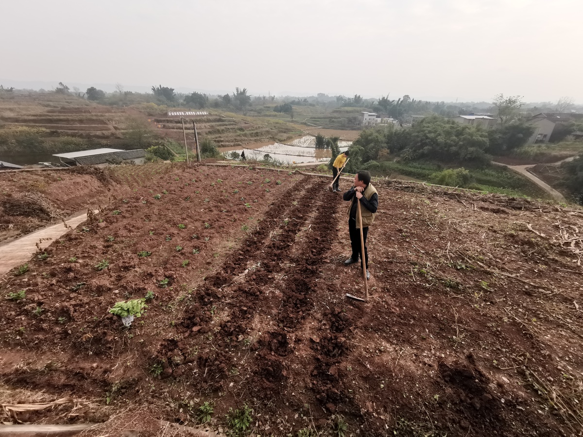 “我们一直在外务工,这次回家帮家里老人种点菜。现在的地,比以前好打整多了。”郑仁贵穿着皮鞋在地里锄地,被妻子打趣说平时就不爱干活路。