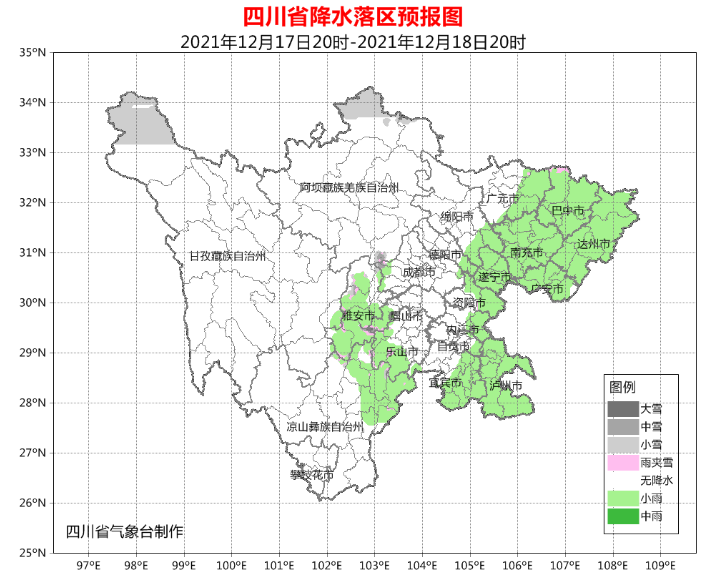 预计今天(12月17日)晚上到明天白天,巴中、达州、南充、广安、遂宁、泸州、雅安7市和乐山、宜宾2市南部及广元、资阳、内江3市东部阴天有小雨或零星小雨,盆地其余地方阴天间多云;甘孜、阿坝2州北部和凉山州东北部多云间阴,局部有阵雪(雨),川西高原和攀西地区其余地方多云间晴。