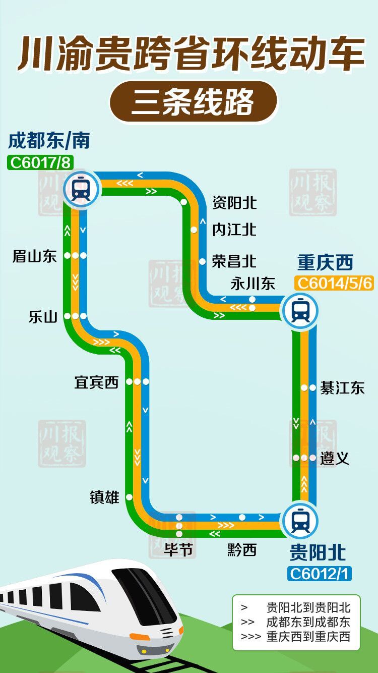 中国铁路成都局分别以成都、贵阳、重庆为起点,开行三趟动车,环绕川渝贵三省市跑一圈后回到起点。其中,成都东至成都东的C6017次今天首发,贵阳北至贵阳北C6012次、重庆西至重庆西C6014次分别于4月11日和12日首发。