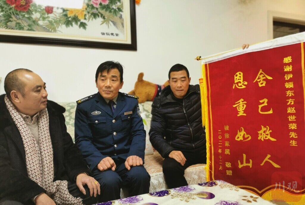 12月16日,落水女子在其家属陪同下来到赵世荣家中,将一面写有“舍己救人,恩重如山”的锦旗送到他手中。