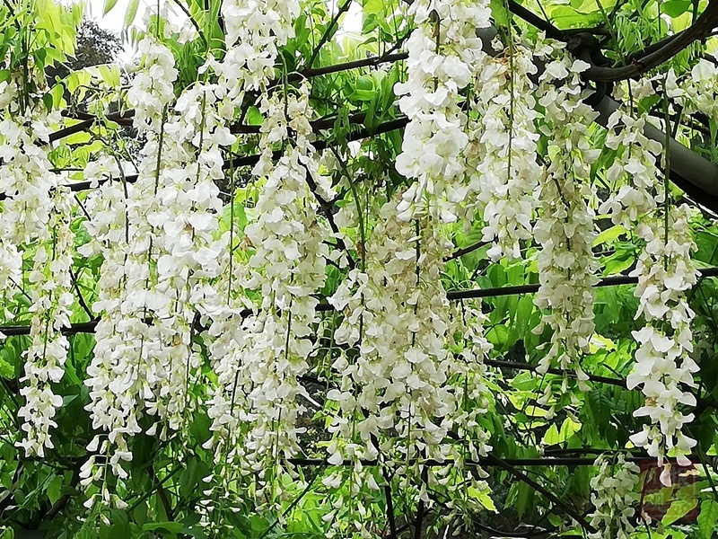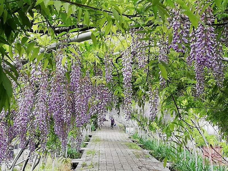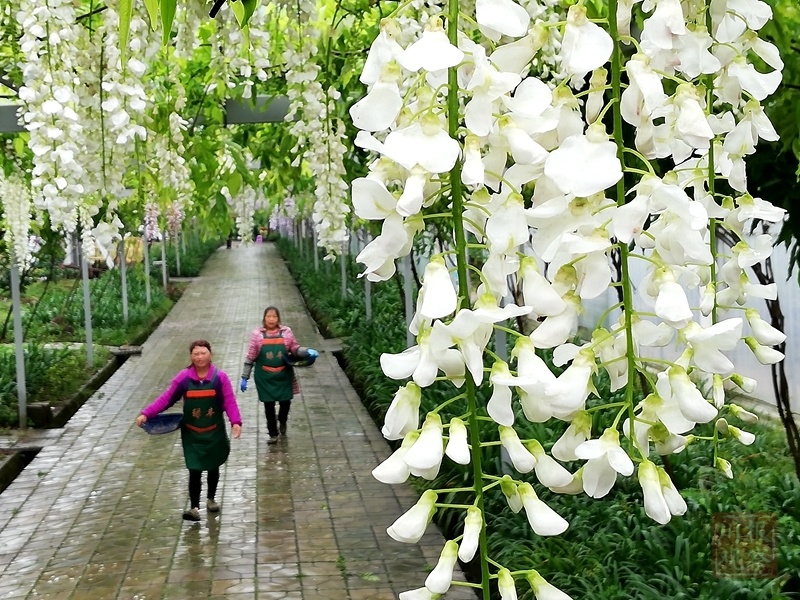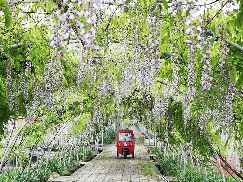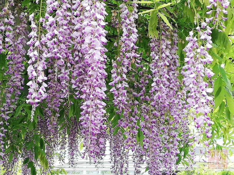 “周公渡生态农庄3年前从日本、德国引进的这些新品种,花穗最长可达1米多,短的也有七八十公分长,每年4月初至中下旬开花,花期一般可达20来天。盛开的紫藤花,像瀑布一样垂挂下来,美得简直让人惊叹……”
