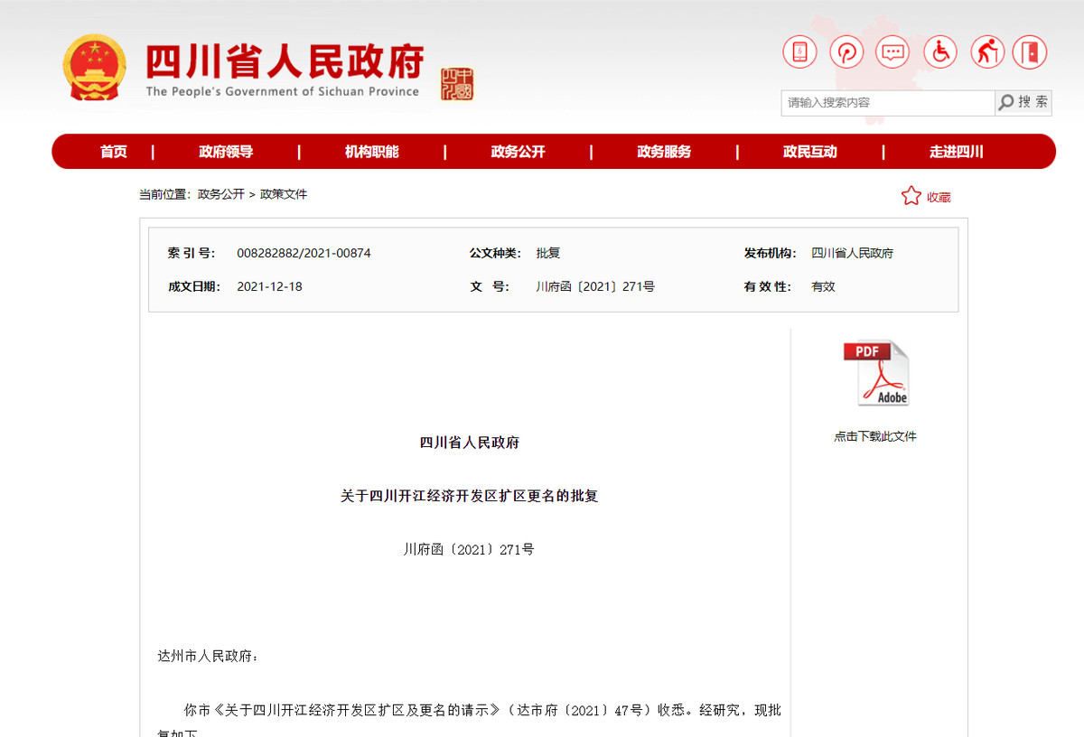 12月20日,四川省人民政府网发布《关于四川开江经济开发区扩区更名的批复》,同意四川开江经济开发区扩区并更名为四川达州东部经济开发区。