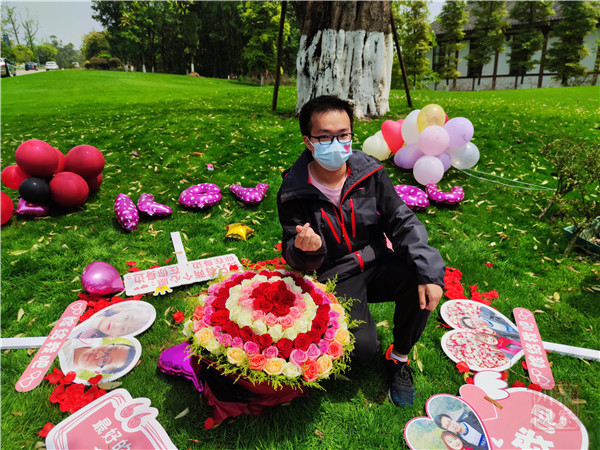 “离开成都时,我就对她说过,等我回来一定要向她求婚。”拿着玫瑰,王旭涛难掩求婚后的激动。他告诉记者,在武汉时没有时间仔细想具体要怎么求婚,回来隔离期间才酝酿了一下,这些气球和花都是同事和他一起弄的,“虽然仪式简朴,但是我们都觉得很有意义。”