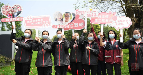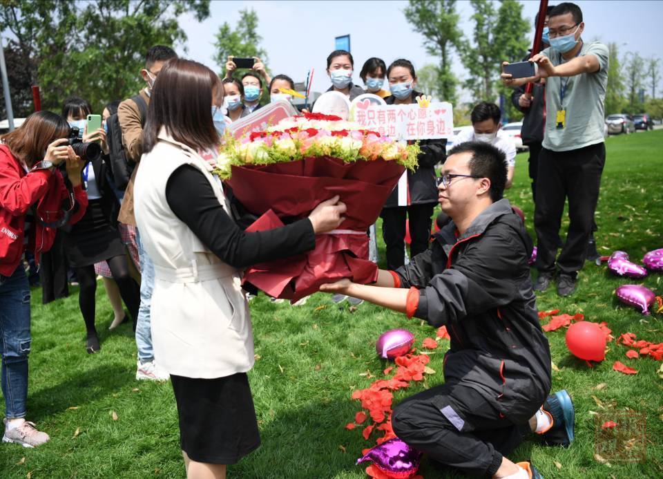 4月14日中午1点半,在眉山市黑龙滩定点隔离酒店,我省第三批援助湖北医疗队队员、成都医学院第一附属医院重症医学科男护士王旭涛手捧玫瑰,半跪在酒店广场旁的一颗大树下,向女朋友、消化内科护士肖雪梅求婚。