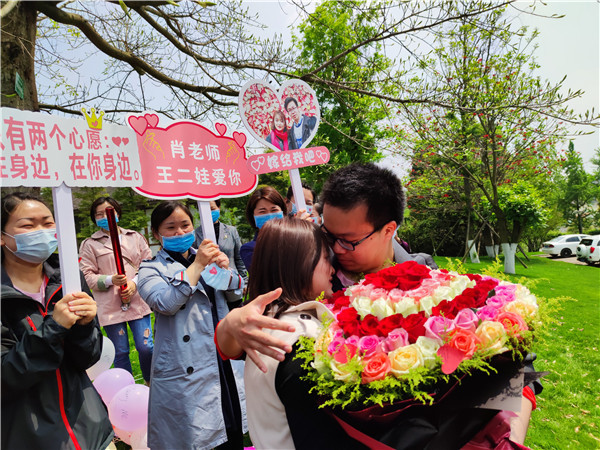 “那捧玫瑰花是我昨晚上专门预定好的。” 王旭涛告诉记者,之所以会选择在解除隔离当天求婚,是因为2月2日离开成都去武汉的时候对肖雪梅承诺了如果平安回来要向她求婚,“现在我回来了,就说到做到。”