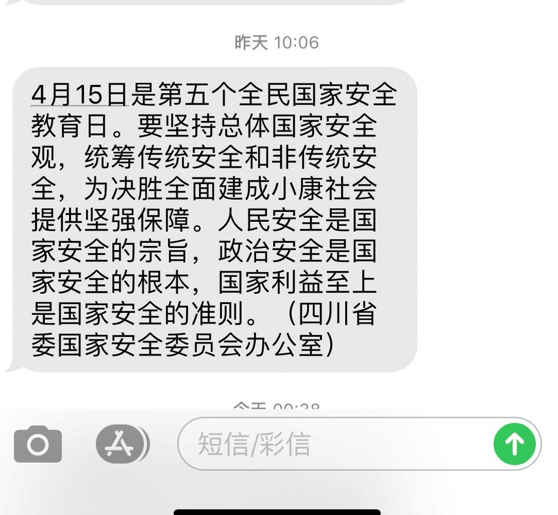我省统一发送的短信内容为“4月15日是第五个全民国家安全教育日。要坚持总体国家安全观,统筹传统安全和非传统安全,为决胜全面建成小康社会提供坚强保障。人民安全是国家安全的宗旨,政治安全是国家安全的根本,国家利益至上是国家安全的准则。”在此基础上,各地还结合实际,协调运营商推送其他相关公益短信,如成都市通过短信告知公众国家安全人人有责,“国家安全机关受理举报电话为12339”。