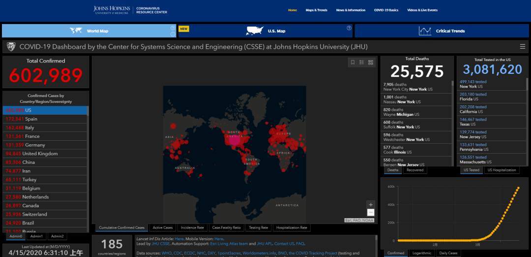 据美国约翰斯·霍普金斯大学发布的全球新冠肺炎数据实时统计系统,截至美国东部时间4月14日晚6时,全美共报告新冠肺炎确诊602989例,死亡25575例,共检测3081620例。在过去24小时,全美新增确诊25682例,新增死亡2356例。目前全美确诊上万例的州已经达到13个。