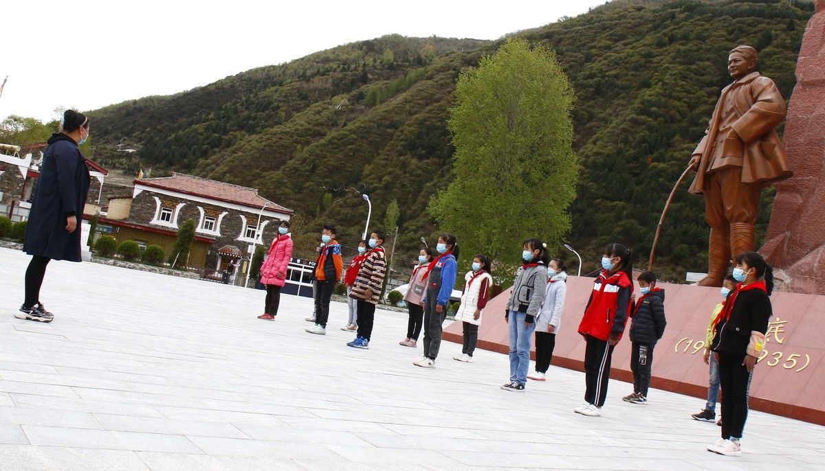 在马尔康市松岗镇直波村全国国家安全教育基地——胡底革命烈士纪念广场,松岗镇中心小学五年级15名学生在班主任黄河涛的引导下,重温了革命烈士胡底的故事。