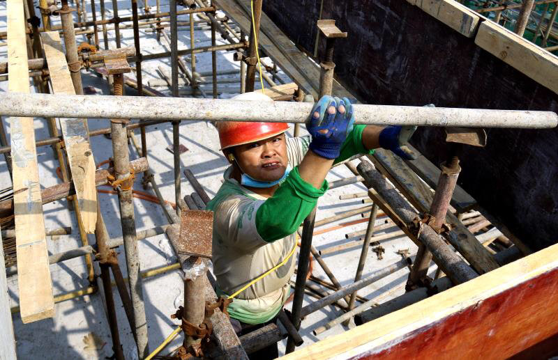 杨光勇是施工现场的一名老木工,有着30多年的从业经历,目前手下有6名木工跟着他一起干活。从今年2月25日项目复工以来,他们几乎没有休假,一直在抢进度。