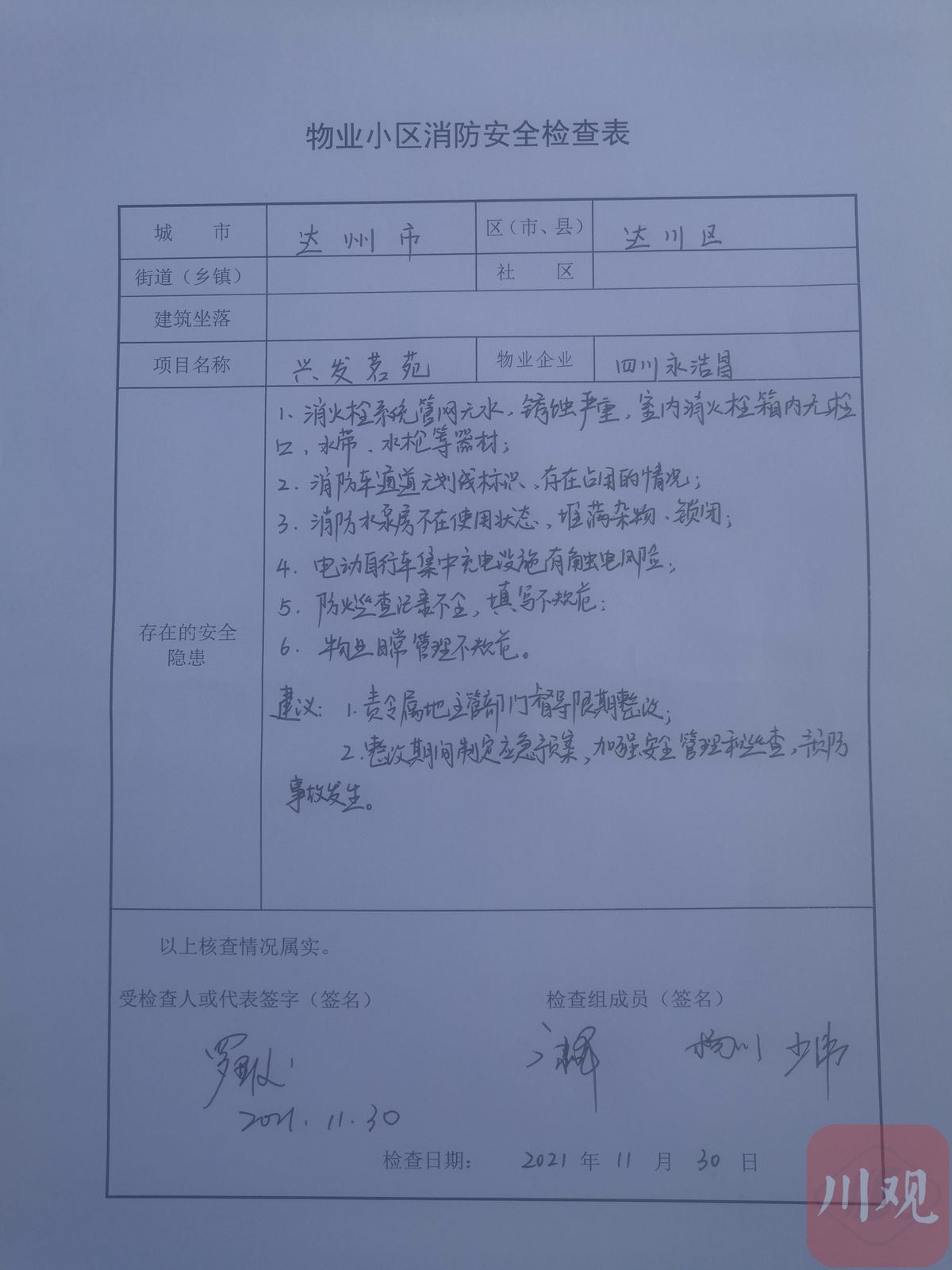 11月30日,四川省住建厅联合四川省消防救援总队,组织执法人员、物业管理专家、媒体记者来到位于达州市南国大道二段999号的兴发茗苑小区,随机抽查、直插现场,开展“住建安全在行动”暗访行动,在该小区发现多处重大消防安全隐患。