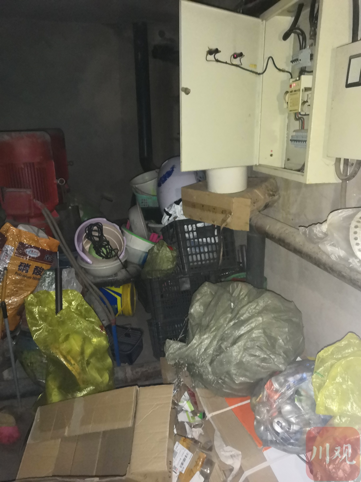 在小区楼道内,暗访组成员未发现一个灭火器材。进入小区地下负一楼,这里是小区消防水泵房,被一道铁锁锁着。借着手机光亮,暗访组成员发现:这一本来应该经常维护的消防水泵房里,堆满了捆扎好的各种纸板、塑料瓶等回收垃圾,凌乱地堆了一屋子。