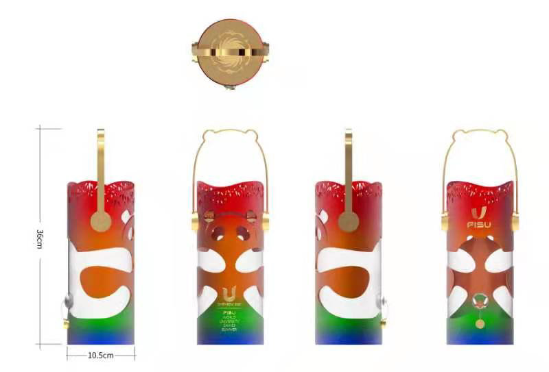 成都大运会火种灯与大运会火炬“蓉火”形成系列,以传统手提式马灯造型与现代耳机形式巧妙结合,仿佛聆听来自世界全球的祝福。透空的大熊猫和竹叶与炫丽的色彩在虚实之间巧妙融合,整体造型体现了成都和谐与包容的文化内涵。