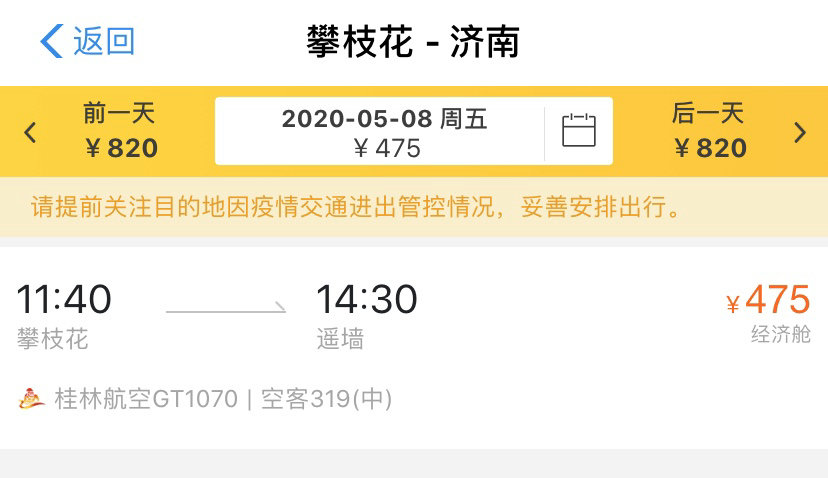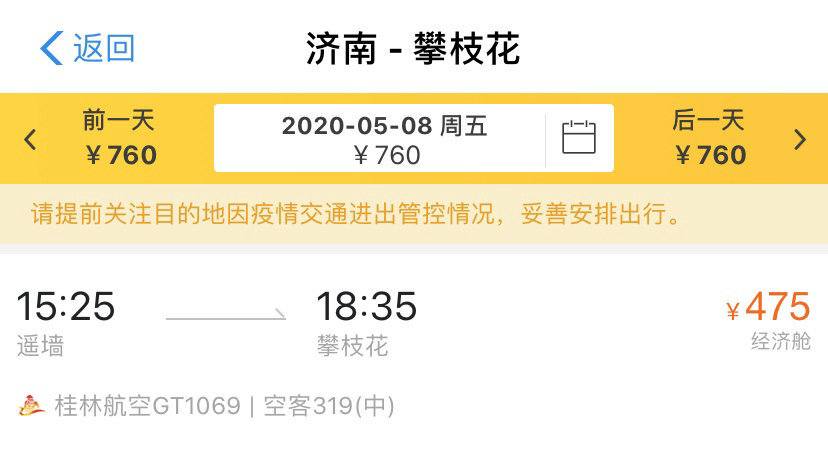 攀枝花—济南航线,航班号为GT1069/GT1070,计划班期为每周五、日,执飞机型为空客A319,由桂林航空公司执飞,票价为475元