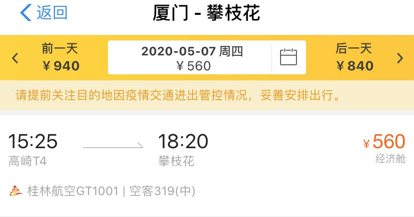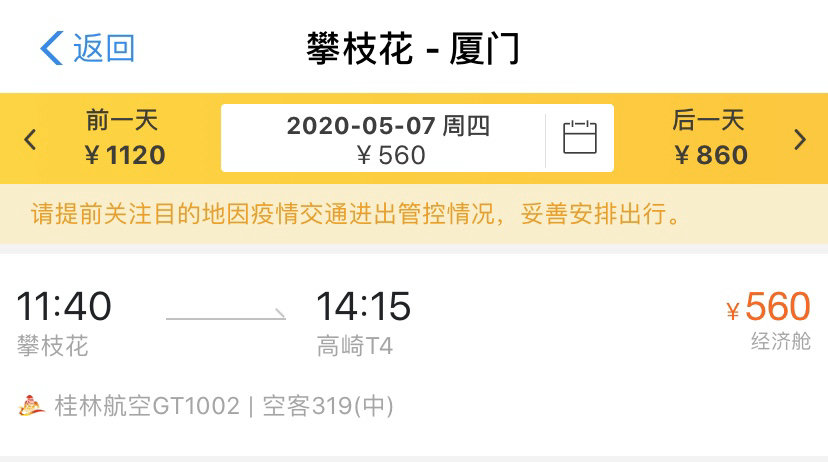 攀枝花—厦门航线,航班号为GT1001/GT1002,计划班期为每周四、六,执飞机型为空客A319,由桂林航空公司执飞,票价为560元。