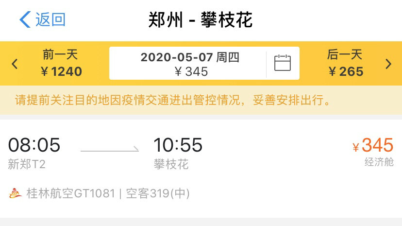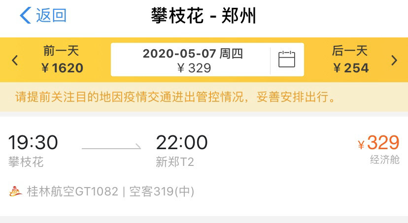 记者通过搜索相关订票软件发现,攀枝花—郑州航线,航班号为GT1081/GT1082,计划班期为每周四、五、六、日,执飞机型为空客A319,由桂林航空公司执飞,票价为329元。