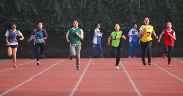 (3)第一圈一过,要开始盯住你前面的同学,死死地跟住她,一但超过了,就去盯前面的同学,就别让她超回来。因为你去追前面的同学,你速度快了,前面的同学感觉到后面有人在追自己,会有压迫感,也会加速,你再死死地跟住,你的速度就上去了。这时候,你会感觉很累的,不过,要在这个时候挺住。