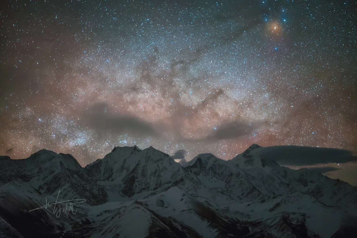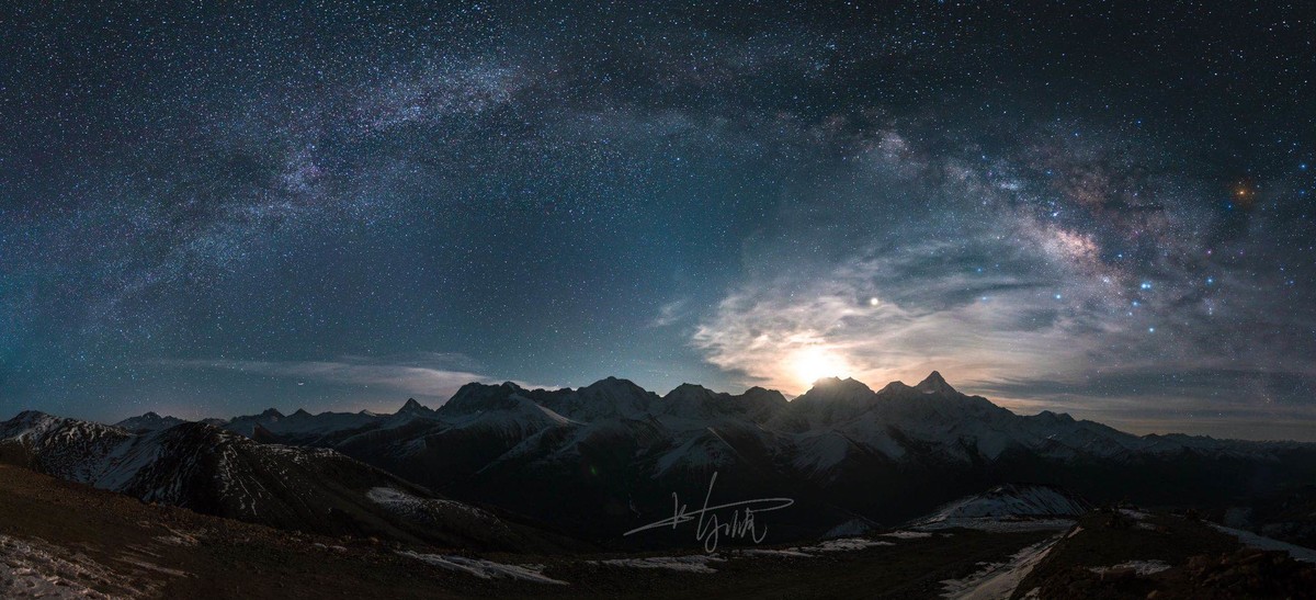 巧合的是,2019年4月17日,他陪着朋友陈成在川西高原拍下斩获2019《国家地理》大奖的摄影作品《国王礼帽》,记录下白云形成帽状,宛若给贡嘎加冕的奇景。时隔一年后的同一天,他自己又拍下“寒夜灯柱”这一奇景。“或许我们都和川西有着特别缘分。”陈忱透露,自己很幸运能拍下这样的自然奇观,但是这看似偶然的背后,或许也有着必然。为了拍摄这些美景,他们常常通宵守候,等待日落日出,星河升起。而这次在黑石城的拍摄,也是他今年拍摄银河星空的第四站,此前他已经在折多山、雅哈垭口、渔子西曲莫贡进行拍摄。除了拍下寒夜灯柱,4月15日凌晨4点左右,他还在雅哈垭口拍下“银河之眼”的美景,即月亮升于银河拱桥之间的场景。“一年只有5次机会可以拍到这种,只要选好时间和地点,这种拍摄难度不大。”