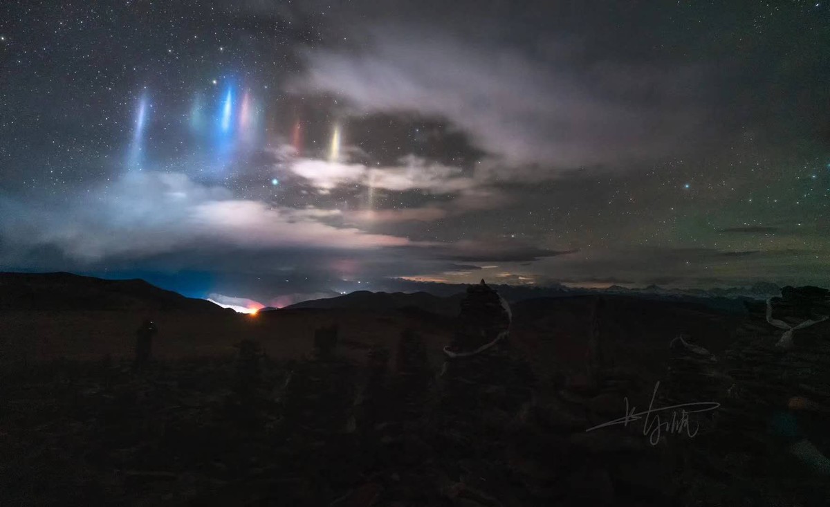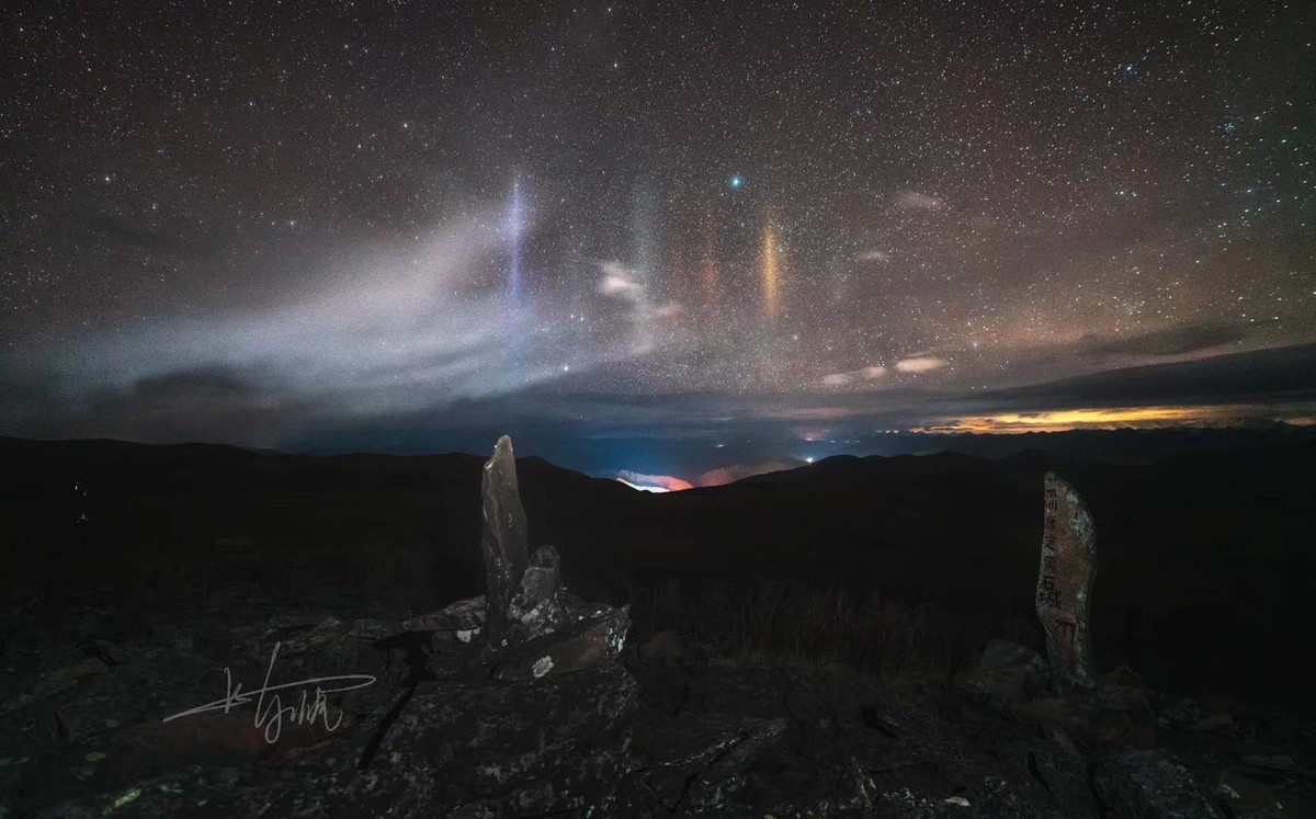满天繁星中,白云浮动,红橙绿紫等不同颜色的“光柱”宛若利剑直冲天际。这是成都摄影师陈忱4月17日在甘孜康定黑石城一带拍下的奇妙天象——寒夜灯柱。