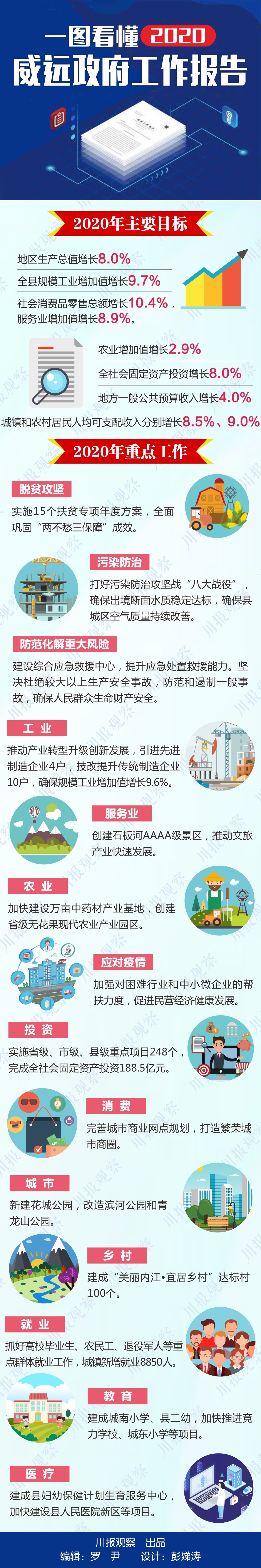 2020年是全面建成小康社会和“十三五”规划收官之年。今年威远县政府工作的总体要求是:以习近平新时代中国特色社会主义思想为指导,坚决贯彻党的基本理论、基本路线、基本方略,增强“四个意识”、坚定“四个自信”、做到“两个维护”,深入贯彻党的十九大和十九届二中、三中、四中全会精神,全面贯彻落实习近平总书记对四川工作系列重要指示精神和中央经济工作会议精神,全面贯彻落实省委十一届三次、四次、五次、六次全会和省委经济工作会议精神,全面贯彻落实市委七届八次、九次、十次全会和市委经济工作会议精神,扎实抓好县委十四届十次全会和县委经济工作会议各项部署落地落实,坚持稳中求进工作总基调,坚持新发展理念,坚持以供给侧结构性改革为主线,坚持以改革开放为动力,推动高质量发展,坚决打赢三大攻坚战,全面做好“六稳”工作,把握重大机遇,统筹推进稳增长、促改革、调结构、惠民生、防风险、保稳定,坚定推动转型发展、创新发展、跨越发展,致力再造一个产业威远,积极争创全省县域经济发展强县,奋力夺取疫情防控和实现经济社会发展目标双胜利,确保“十三五”规划圆满收官和全面建成小康社会。