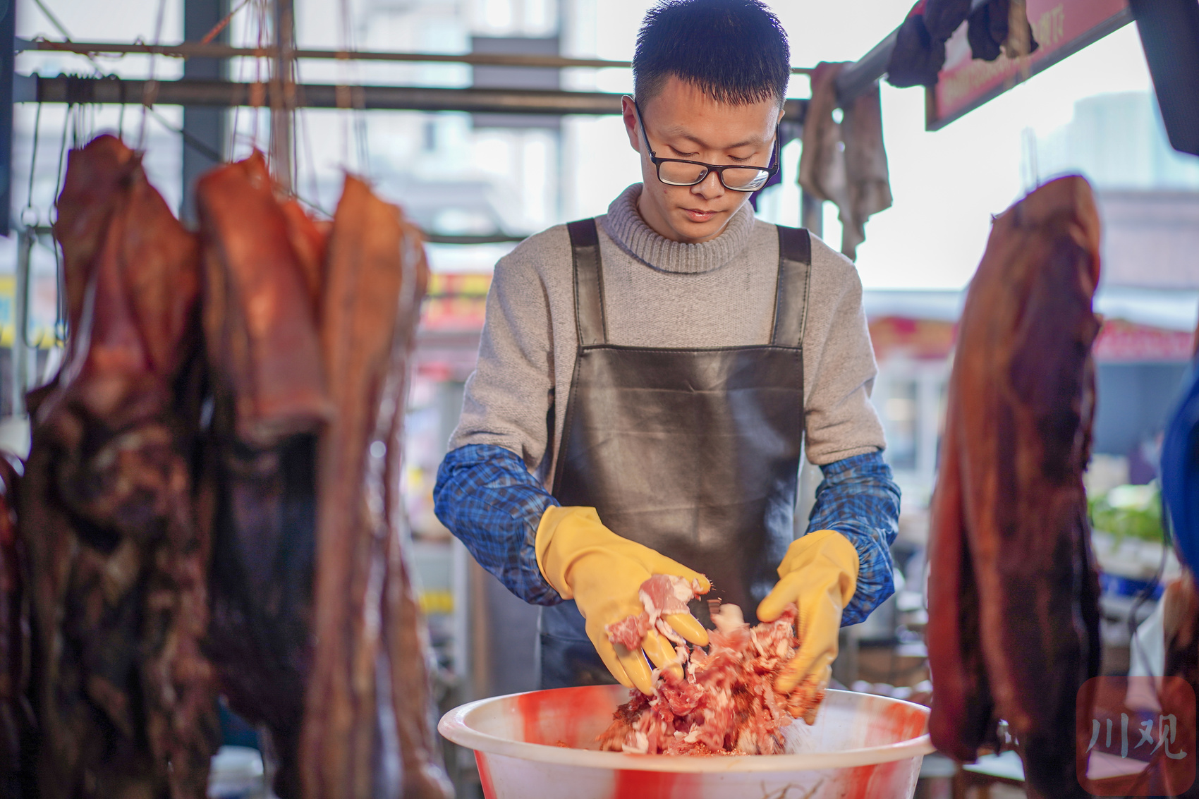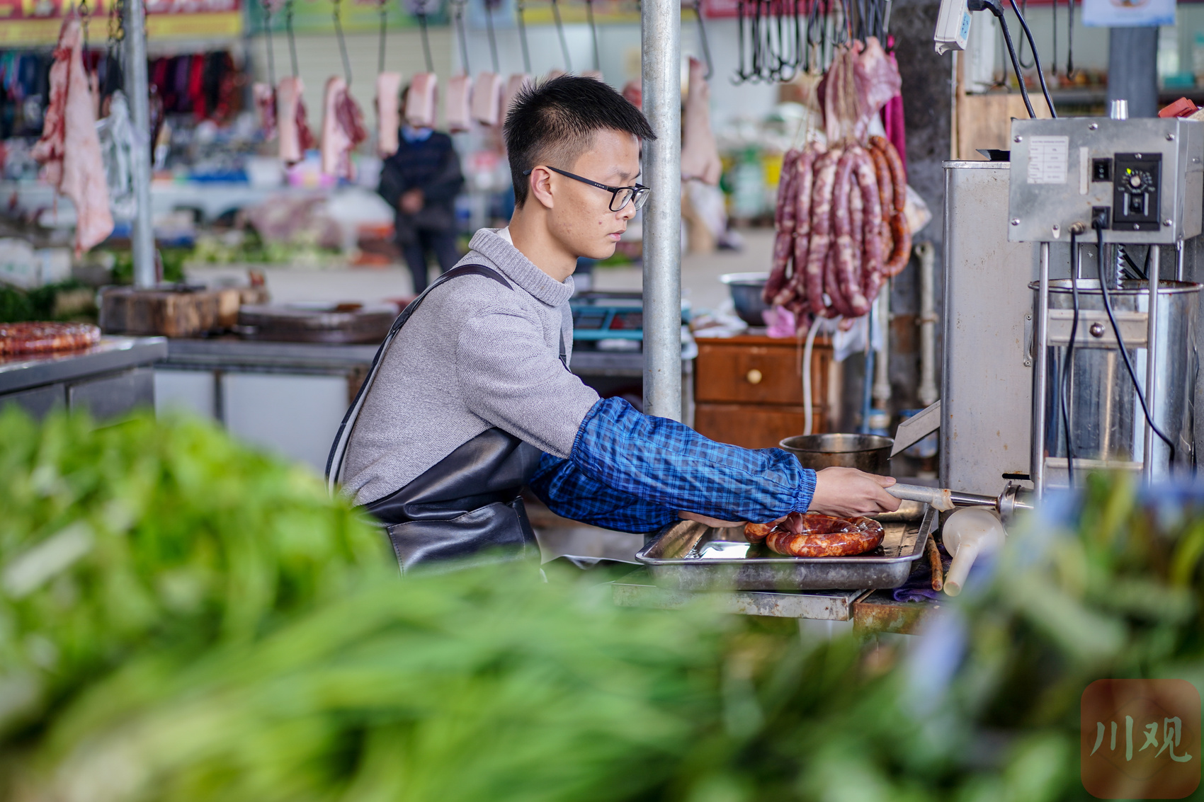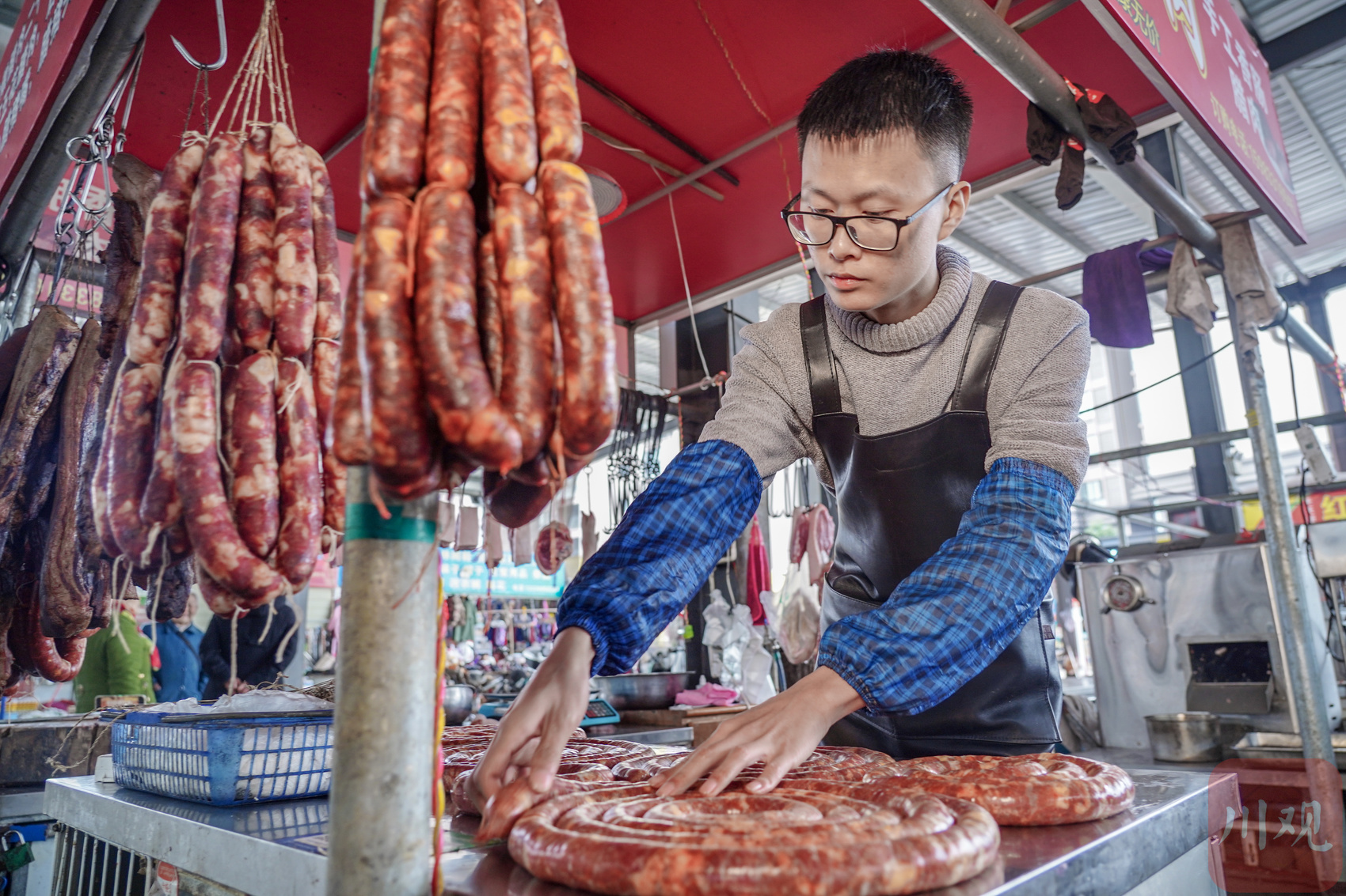 随着一根根红彤彤的香肠高高挂起,浓浓的年味也扑面而来。近日,在眉山市彭山区一农贸市场内,一位年轻小伙正在用心制作香肠,这些香肠是他做给国外的同学们的。