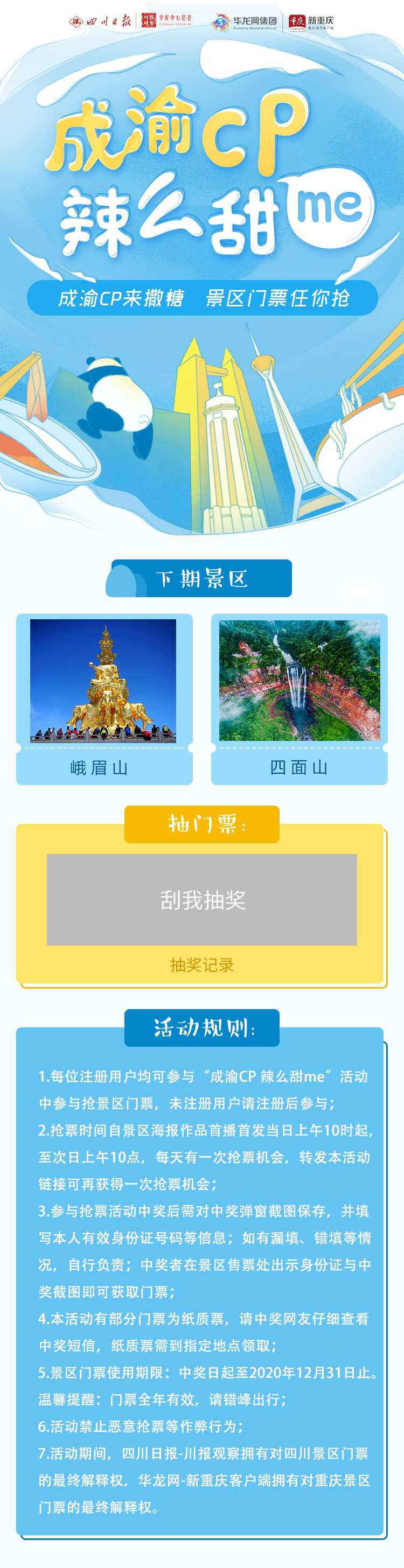 4月21日-4月30日,每天上午10时起,登陆四川日报-川报观察客户端参与抽景区门票活动,成渝cp福利等你甜蜜亲启!没有抢到的朋友,也可以移步华龙网-新重庆客户端同步参与。