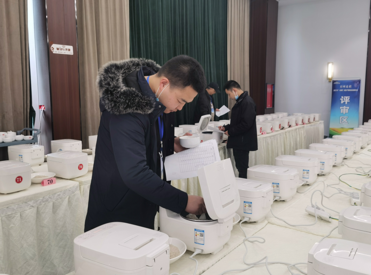 “米质好的大米外观垩白少、透明度高,煮熟后香气浓郁、口感好。”12月24日上午9时,眉山市东坡区2021年“一优两高”水稻生产竞赛活动评审区,104个电饭煲一字排开。四川农业大学水稻研究所的杨志远博士正站在59号电饭煲面前,左手拿起生米仔细翻看,右手熟练地打开锅盖,凑近闻了闻,舀出一勺煮好的白米饭放进嘴里品尝。看、闻、尝三步动作完成后,杨志远心里有了结论,在评分表“米质”一栏里写下分数。