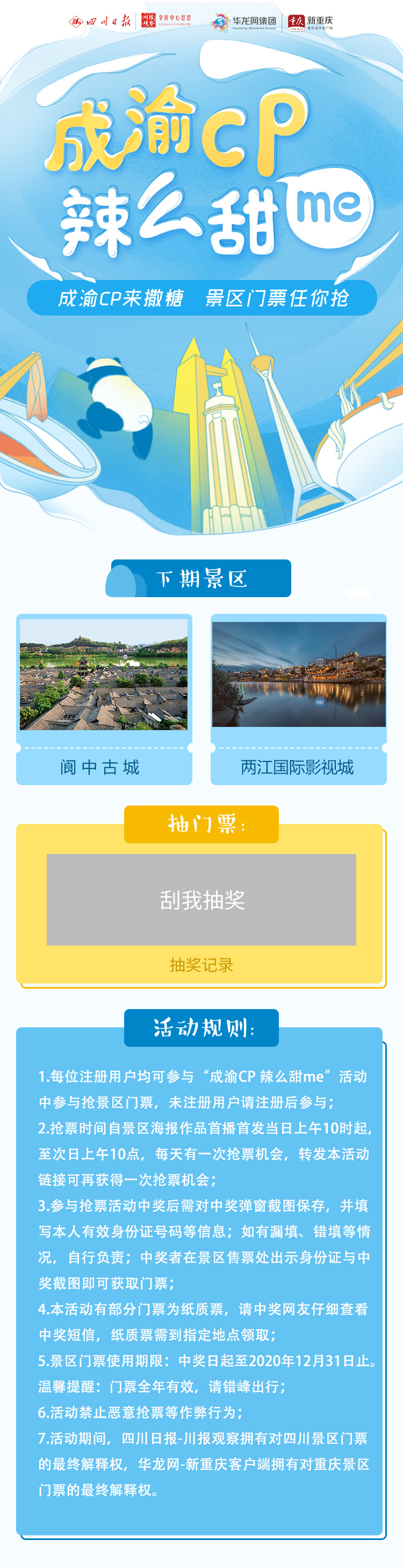 4月21日-4月30日,每天上午10时起,登陆四川日报-川报观察客户端参与抽景区门票活动,成渝cp福利等你甜蜜亲启!没有抢到的朋友,也可以移步华龙网-新重庆客户端同步参与。
