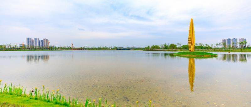 记者在现场看到,清澈的菁蓉湖岸,6米间宽的骑游绿道环绕,湖心岛上,巨型杜鹃鸟雕塑金光闪闪;郫都区拥有成都最大的水源涵养地,域内柏条河、柏木河、徐堰河、走马河、蒲阳河“五河并流”,拥有得天独厚的生态本底,菁蓉湖水引自红旗支渠,然后又流向清水河,湖中采用沉水植物自然净化的方式,从而实现一湖活水清澈碧绿。