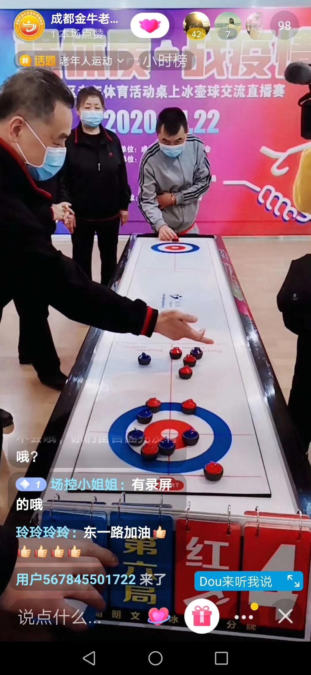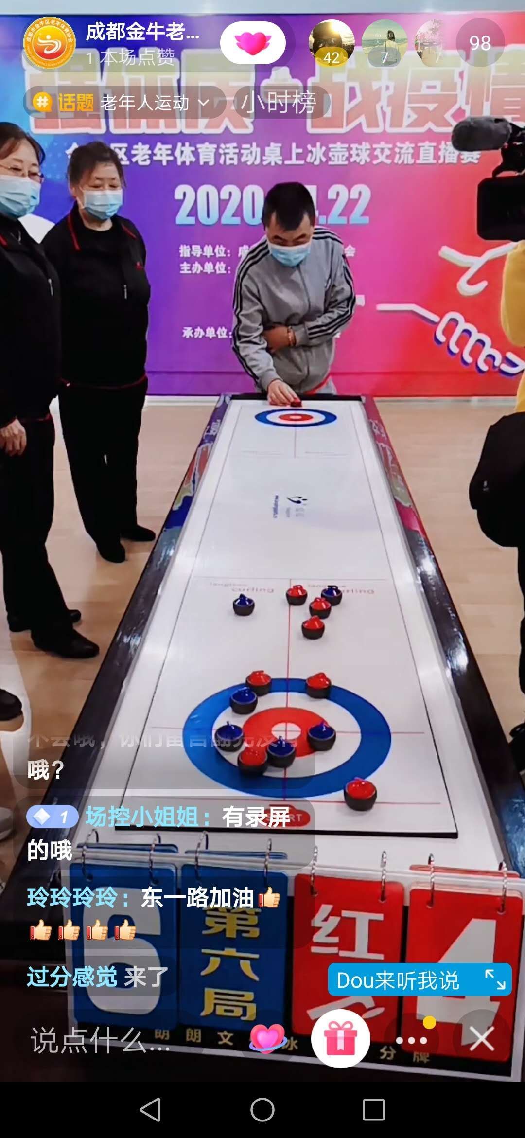 来自金泉街道郎家社区代表队和荷花池街道东一路社区代表队的运动员们进行了激烈的比赛。虽然缺少了热情的现场观众摇旗呐喊,但在直播平台上,却情绪高涨,气氛热烈。一个小时的现场直播,观众总数179人,约99人持续在线观看30分钟以上,收到评论73条,收获音浪103个(网络流行词,抖音里的虚拟货币,音浪越多,人气越高),新增粉丝43人。连续不断的留言点赞助威,专业的直播讲解,也让在直播间的‘小白’们,迅速的了解了桌上冰壶球这项运动,看懂了各项规则,围观群众纷纷表示想亲身感受一下。
