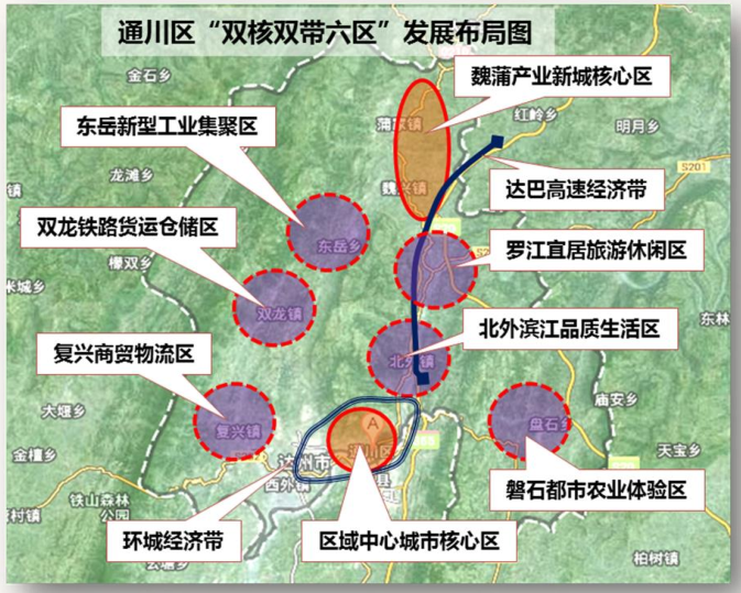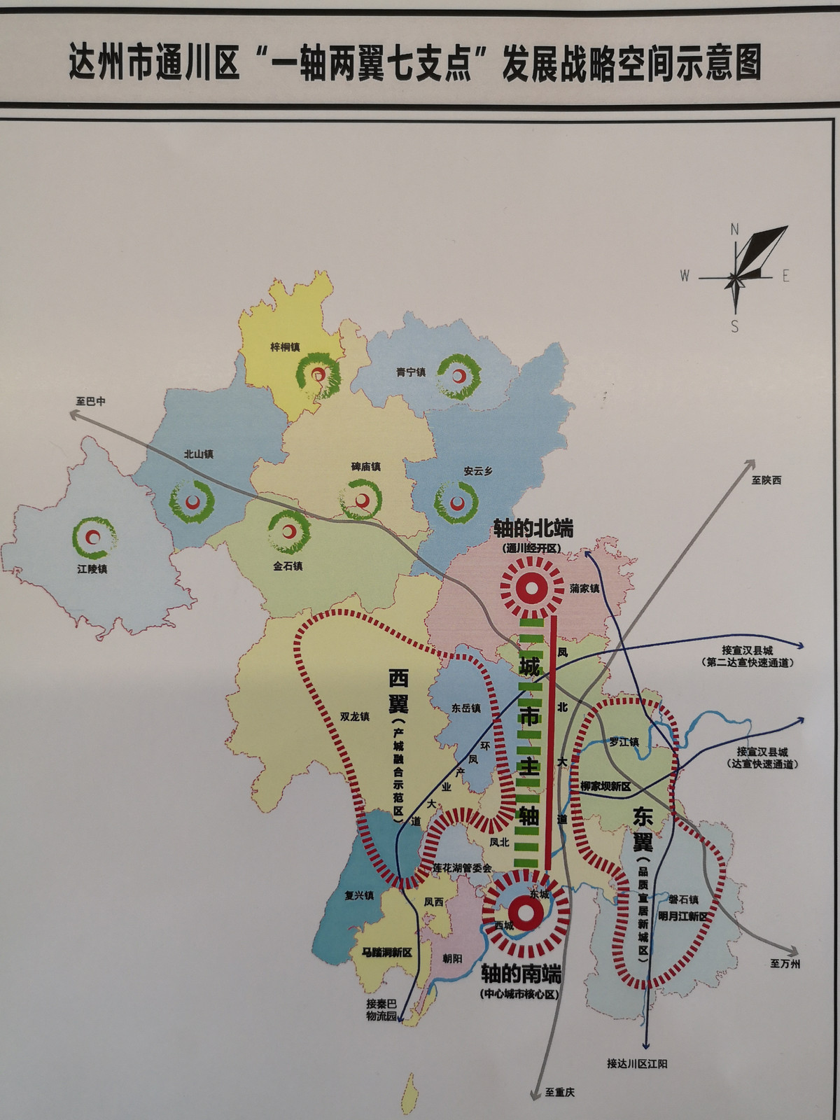 实施“一轴两翼七支点”发展战略,通川区制定了“136”发展规划:“1”,即一年打基础,做好战略实施总体规划,制定“中心城区提质、经开区调位、磐石明月江新区规划、产城融合发展、乡村振兴提速”五大行动方案,力争包茂高速石板至魏兴段改道工程挤进国省盘子,力争经济总量达350亿元,城市规模新增6平方公里、6万人。