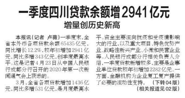 一季度末,全省本外币各项贷款余额65435亿元,同比增长12.2%,较年初增加2941亿元,同比多增343亿元,创季度最高水平。这是记者4月23日从中国人民银行成都分行召开的2020年第一次新闻通气会上获悉的。