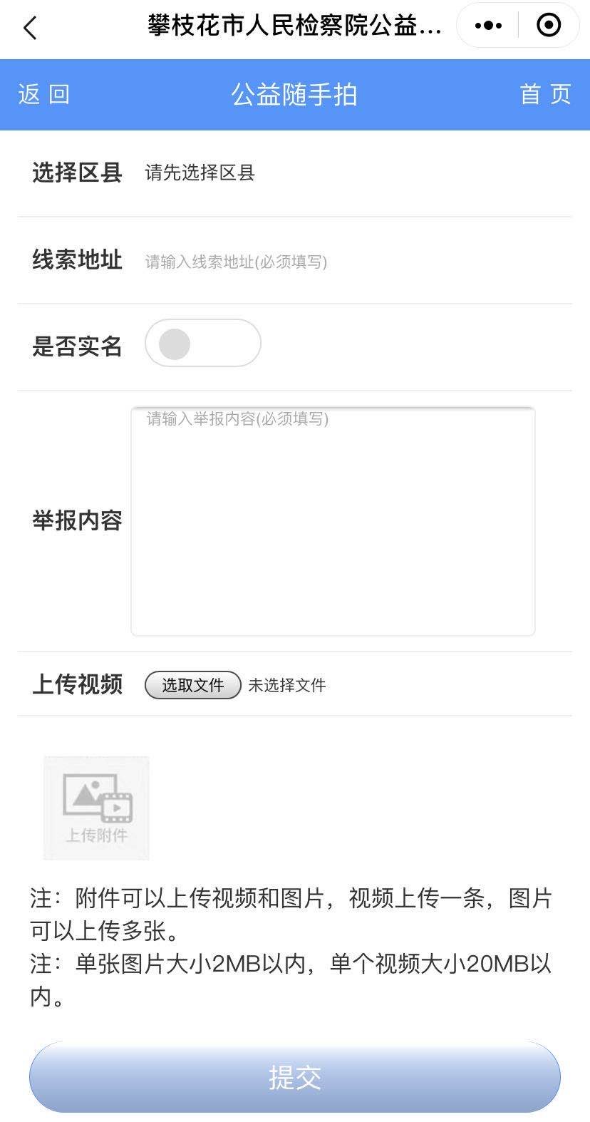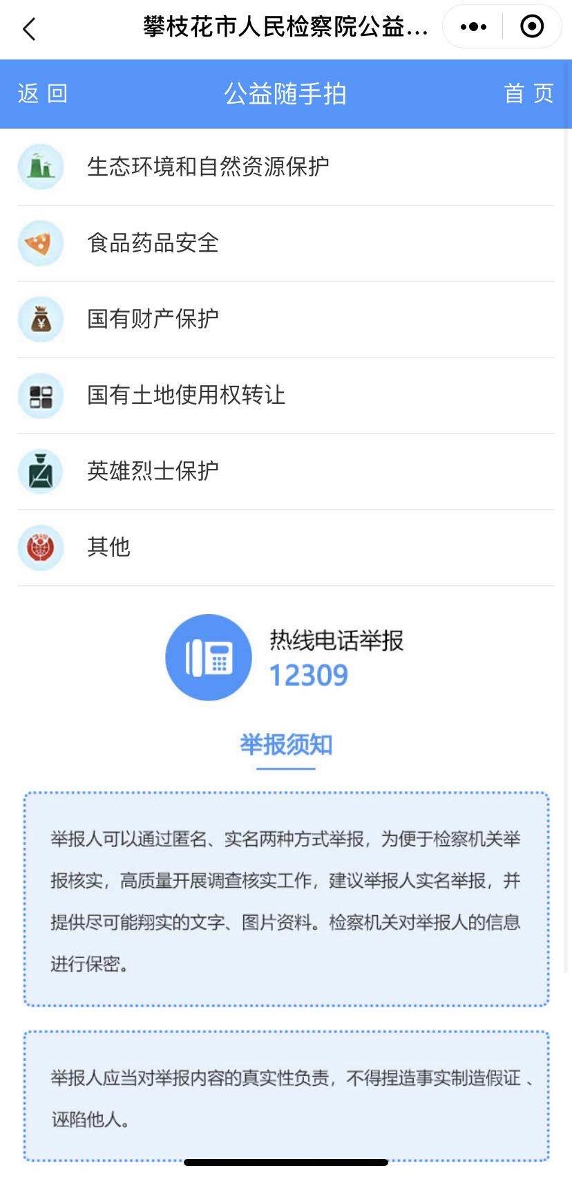 遇到或发现身边有涉及生态环境、食药安全、国有土地使用权出让、国有财产保护、侵害英雄烈士姓名肖像名誉荣誉权等违法行为时,搜索进入“攀枝花市人民检察院公益随手拍”微信小程序后,点击“我要举报”,选择所举报的线索类型,根据提示输入姓名、电话、举报内容、所在地址等信息,并上传相应图片或视频佐证,点击提交即可进行举报。