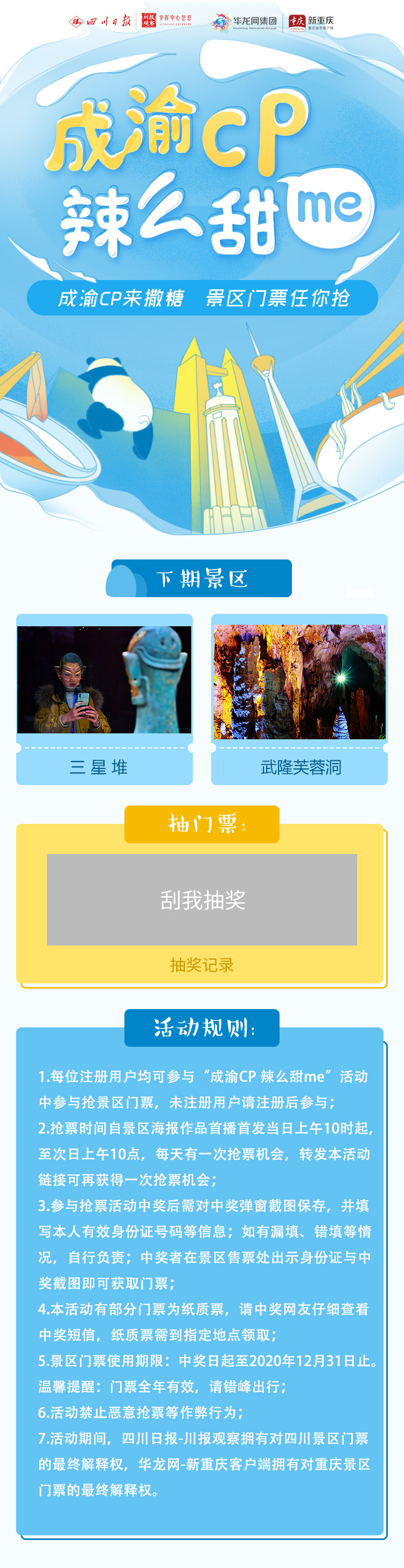 4月21日-4月30日,每天上午10时起,登陆四川日报-川报观察客户端参与抽景区门票活动,成渝cp福利等你甜蜜亲启!没有抢到的朋友,也可以移步华龙网-新重庆客户端同步参与。